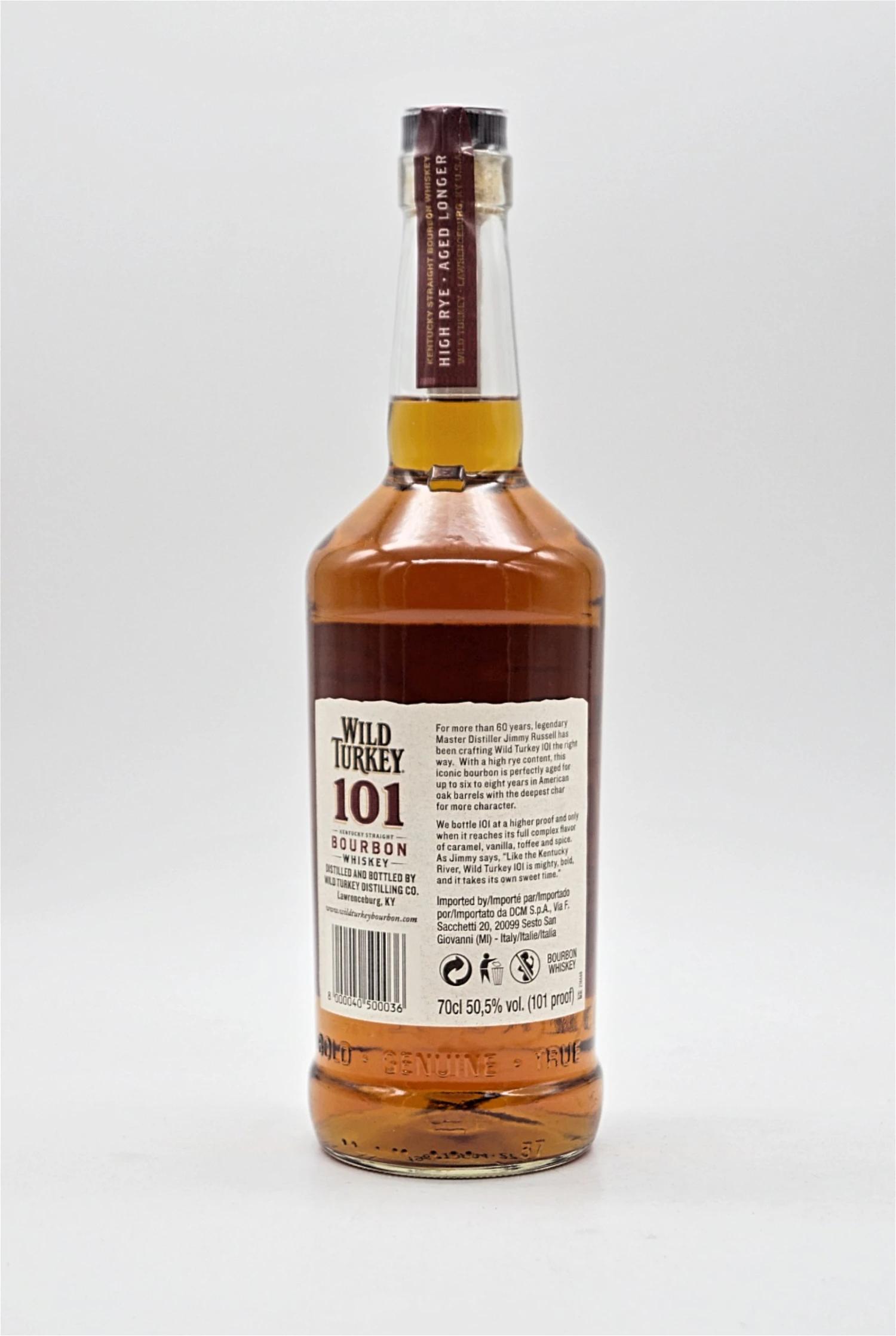 Inhaltsstoffe: Ein Whisky ist nur so gut wie seine Zutaten. Deshalb kommt das Wasser aus dem Kentucky River und wird auf natürliche Weise durch Kalkstein gefiltert, wodurch Eisen und andere Verunreinigungen entfernt werden. Außerdem verwenden sie immer noch ihren ursprünglichen Hefestamm – im Besitz von Wild Turkey – der seit über 60 Jahren den typischen Geschmack unseres Bourbons prägt. Und Sie werden in diesem Bourbon niemals ein gentechnisch verändertes Getreide finden. Weil gentechnikfrei, natürlich und authentisch nur Jimmy Russells Weg ist.