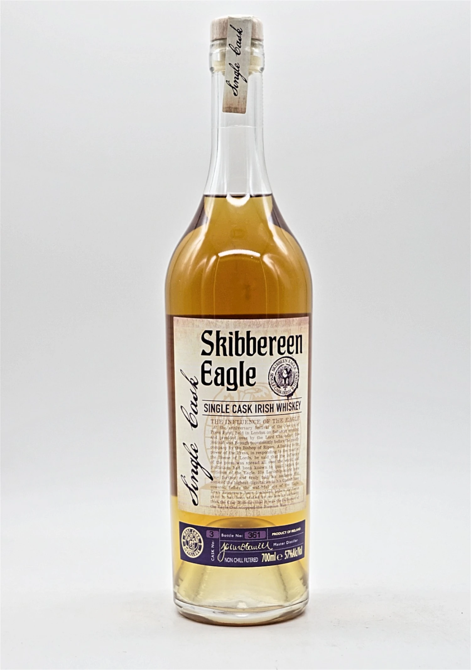 Unter dem Namen „Skibbereen Eagle“ bringt West Cork erstmals Einzelfassabfüllungen auf den Markt. Dieser Single Malt in Fassstärke aus dem Fass Nummer 3 zählt auch zu der Serie. Der Whiskey reifte in einem ehemaligen First Fill Bourbon Barrel. Da er mit 57% Alkoholvolumen abgefüllt wurde, fallen die Aromen entsprechend intensiv aus. Vor allem zeichnet diese Abfüllung eine besondere Honignote aus, die sich vor allem am Gaumen wiederfinden lässt. Daneben kommen typische Fruchtnoten und süße Malznoten zum Tragen. Wie man es von West Cork kennt und schätzt, wurde der Whiskey weder gefärbt noch kühlgefiltert, sondern komplett naturbelassen abgefüllt. Da es sich um eine Einzelfassabfüllung handelt, ist die Flaschenanzahl entsprechend limitiert. Jede Flasche ist nicht nur mit der Fassnummer, sondern auch noch mit der einzelnen Flaschennummer versehen. Die Brennerei von der Westküste Irlands setzt voll auf Transparenz. Auch in einem weiteren Punkt bleibt sich West Cork treu: Guten Whiskey zum fairen Preis. Auch die Single Cask Abfüllungen von West Cork zeichnen sich durch ihr besonders gutes Preis-Leistungs-Verhältnis aus.