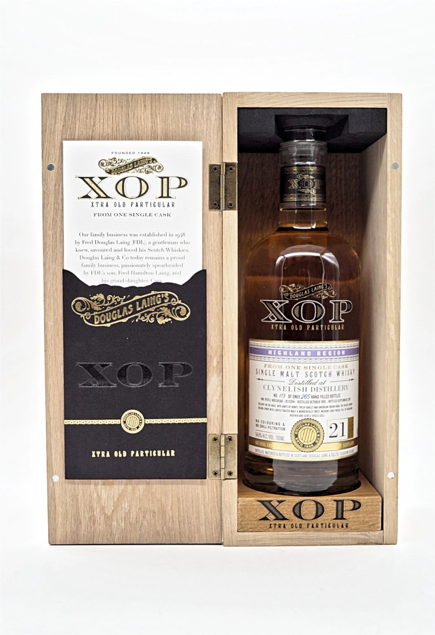 Der „große Bruder“ des Old Particular-Sortiments, Xtra Old Particular. XOP-Abfüllungen repräsentieren die „Familienjuwelen“ von Douglas Laing. Sie behalten sich die spektakulärsten und einzigartigsten Einzelfässer aus den Familienbeständen vor, die unter diesem Label erhältlich sind. Jeder Ausdruck, der in einer luxuriösen Holzkiste präsentiert wird, trägt einen schweren Glasstopfen und ein einzeln nummeriertes Zertifikat und Etikett, das den antiken Single Malt oder Single Grain ehrt, den er trägt.