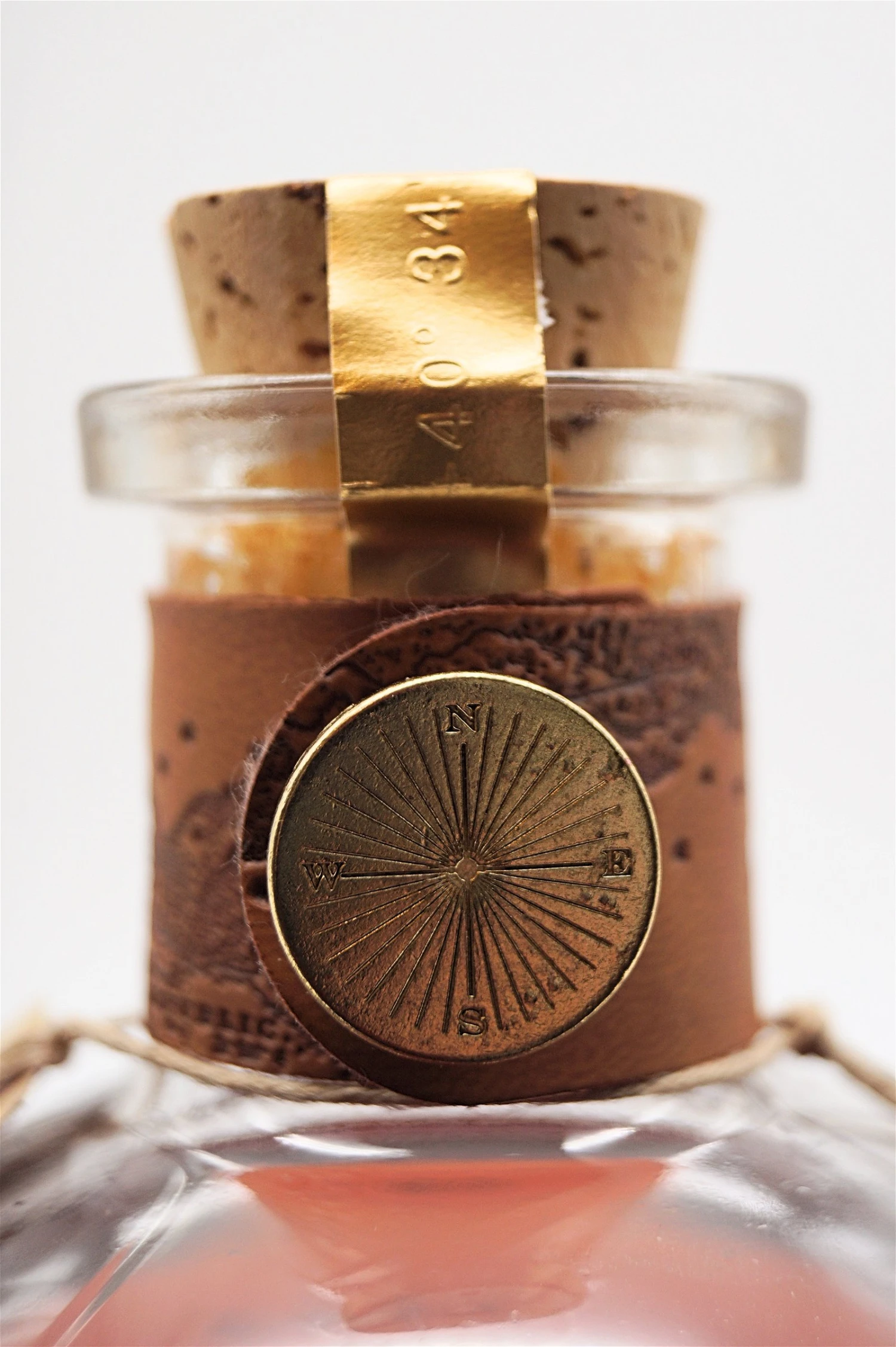 könnte als Griff oder zum Aufhängen der Flasche an einem Schiffsbalken verwendet werden. Um das Konzept der globalen Navigation auszuspielen, ist eine antike Seekarte der Hauptroute des Rumschmuggels im Siebdruck um die Flasche herum angebracht. Der Hals zeigt ein Foto von Kirk und Sweeney und ein Zitat im Stil der Küstenwache mit der Chargen- und Flaschennummer. Zusammen mit dem kunstvollen Logo und dem Sicherheitssiegel, das wie nautisches Messing bedruckt ist, erinnert das Design an das Risiko, das so viele bereit waren, in den 1920er Jahren für einen guten Rumgeschmack einzugehen.