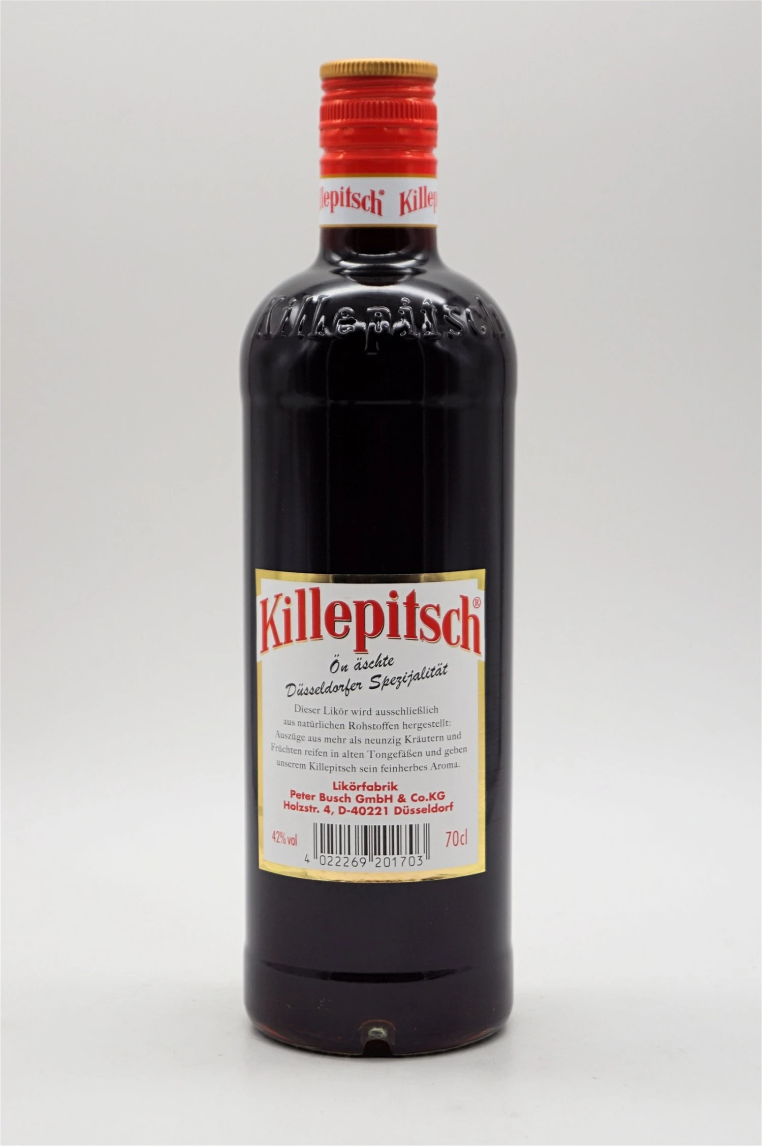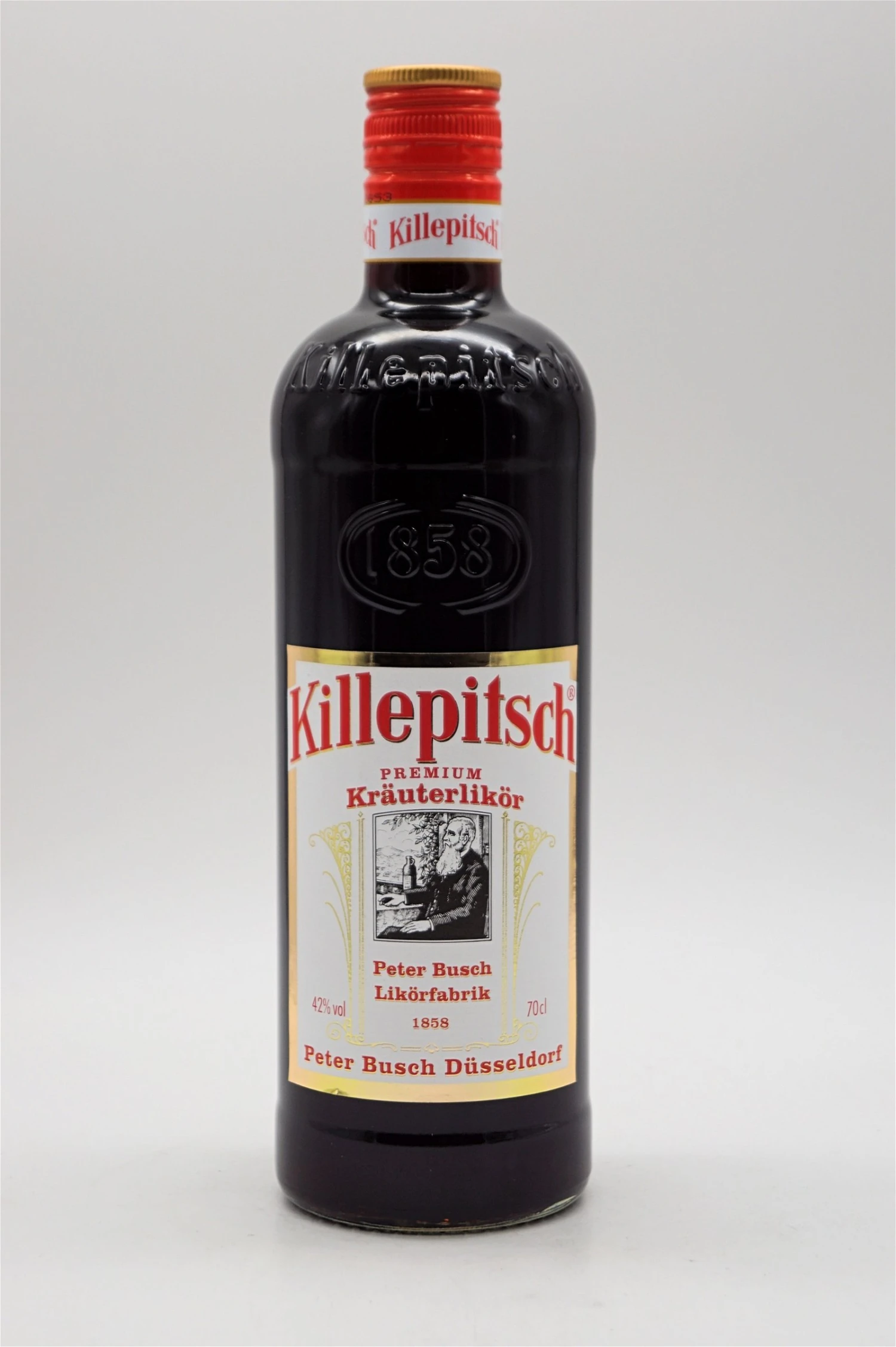 Der mehrfach ausgezeichnete Premium-Kräuterlikör mit 42 Volumenprozent Alkohol wird ausschließlich aus natürlichen Rohstoffen hergestellt. Zutaten aus 98 Kräutern, Beeren und Früchten aus aller Welt lagern in temperierten Edelstahltanks. Die Rezeptur ist ein bis heute wohlgehütetes Familiengeheimnis! Probieren Sie ihn doch einmal: Killepitsch als Shot – eiskalt mit 42 Prozent – oder als leckeren Cocktail.