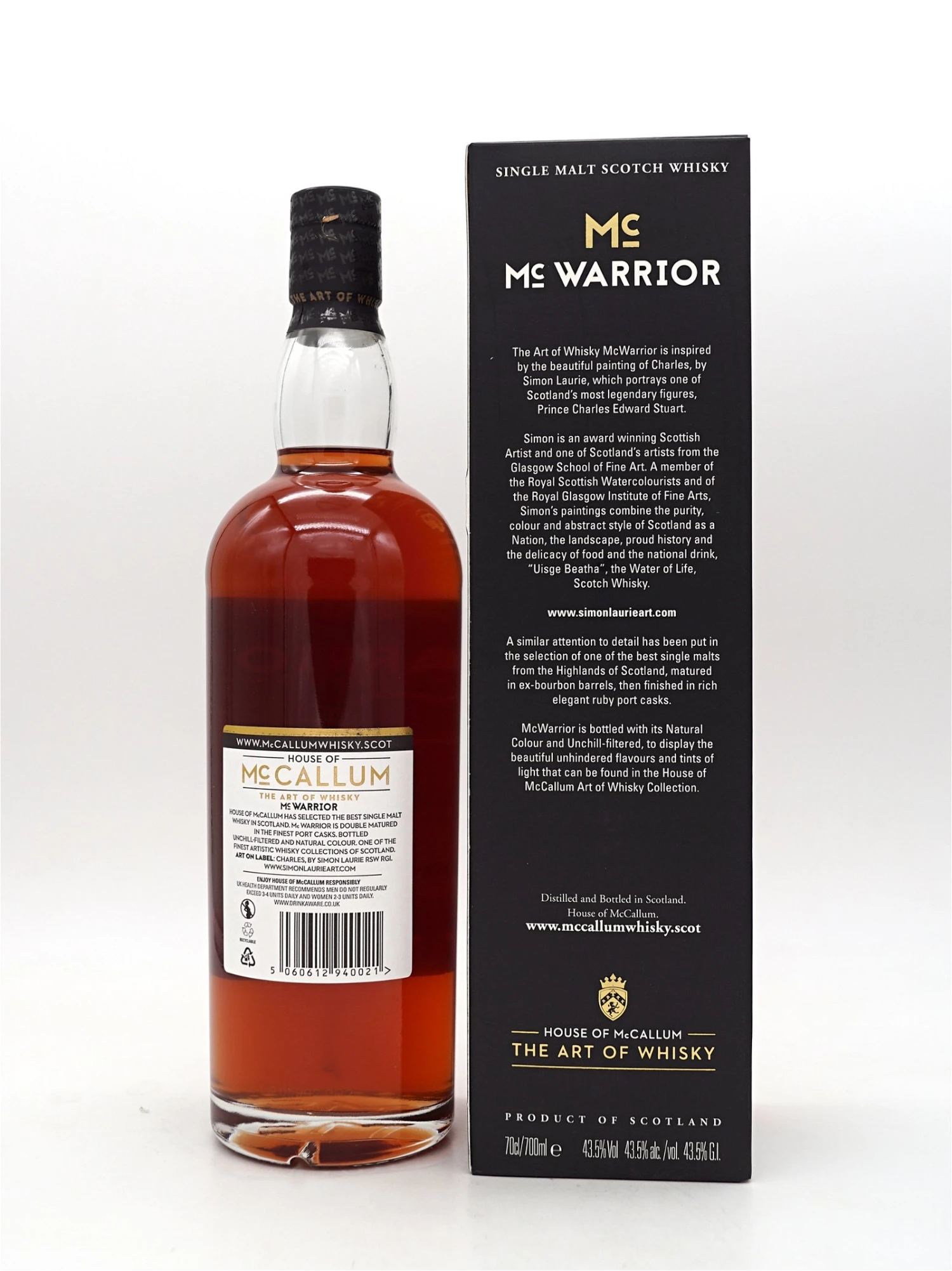 Ein Highland Single Malt, McWarrior, ein entschlossener Kämpfer und Abenteurer, abgebildet von Charles Edward Stuart, dem letzten der schottischen Dynastischen Prinzen von Schottland, dem Enkel von Marie Stuart, der 1745 eine Revolution kämpfte, um die Krone Schottlands und von Schottland zurückzugewinnen England.