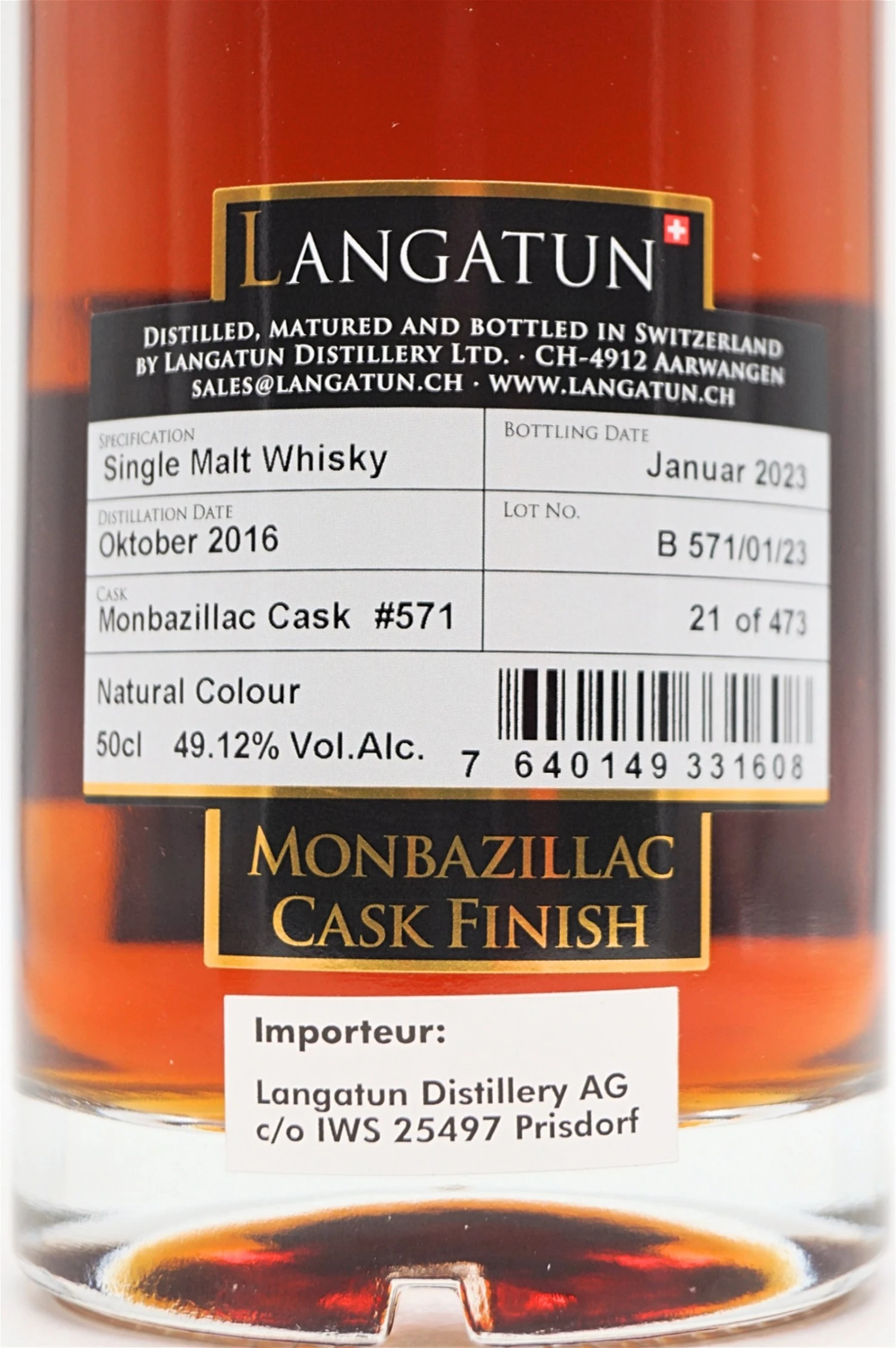 Der Monbazillac Cask Finish ist eine neue Abfüllung in der Cask Finish Reihe von Langatun. Nach der Vorlagerung in einem Chardonnay Fass aus französischer Eiche wurde der Single Malt noch für eine Nachreifezeit von 14 Monaten in ein Monbazillac Süssweinfass aus Frankreich umgelagert. Monbazillac ist ein Weinanbaugebiet im Südosten Frankreichs und umgibt mehrere Gemeinden um das gleichnamige Dorf Monbazillac. Diese Region ist bekannt für ihre intensiven und langlebigen Süssweine, die den Sauternes-Weinen ähneln. Der Monbazillac wird traditionellerweise aus edelfaulen Trauben der Rebsorten Sémillon, Sauvignon Blanc und Muscadelle hergestellt, welche von Hand gelesen werden. Dieser Whisky wurde im Oktober 2016 destilliert und im Januar 2023 abgefüllt.