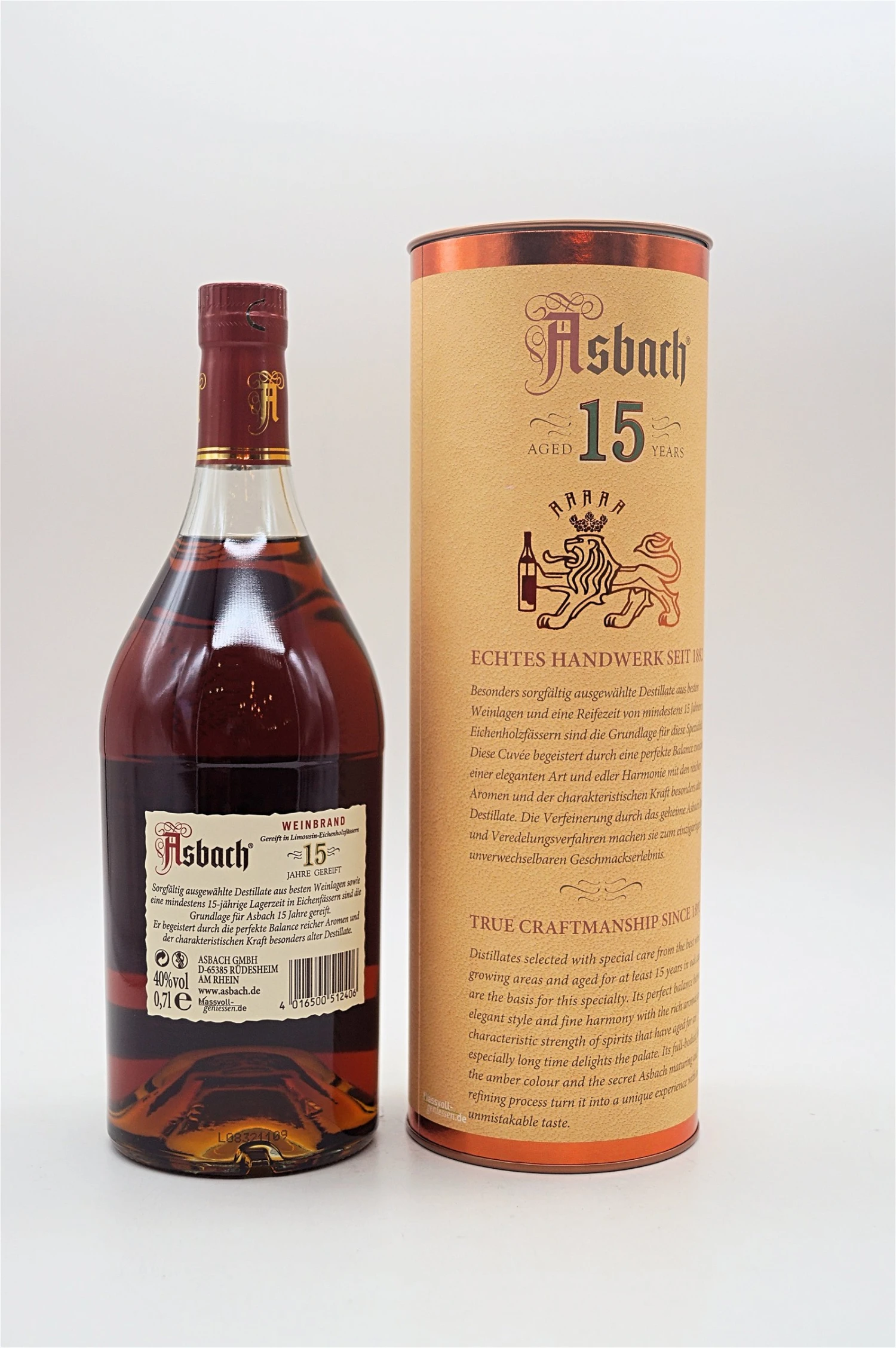 Besonders sorgfältig ausgewählte Destillate aus besten Weinlagen und mindestens 15 Jahren Lagerzeit in Limousineichen-Fässern sind die Grundlage für den Asbach Spezialbrand 15 Jahre gereift. Er begeistert durch eine perfekte Balance zwischen einer eleganten Art und edlen Harmonie mit den reichen Aromen und der charakteristischen Kraft besonders alter Destillate.