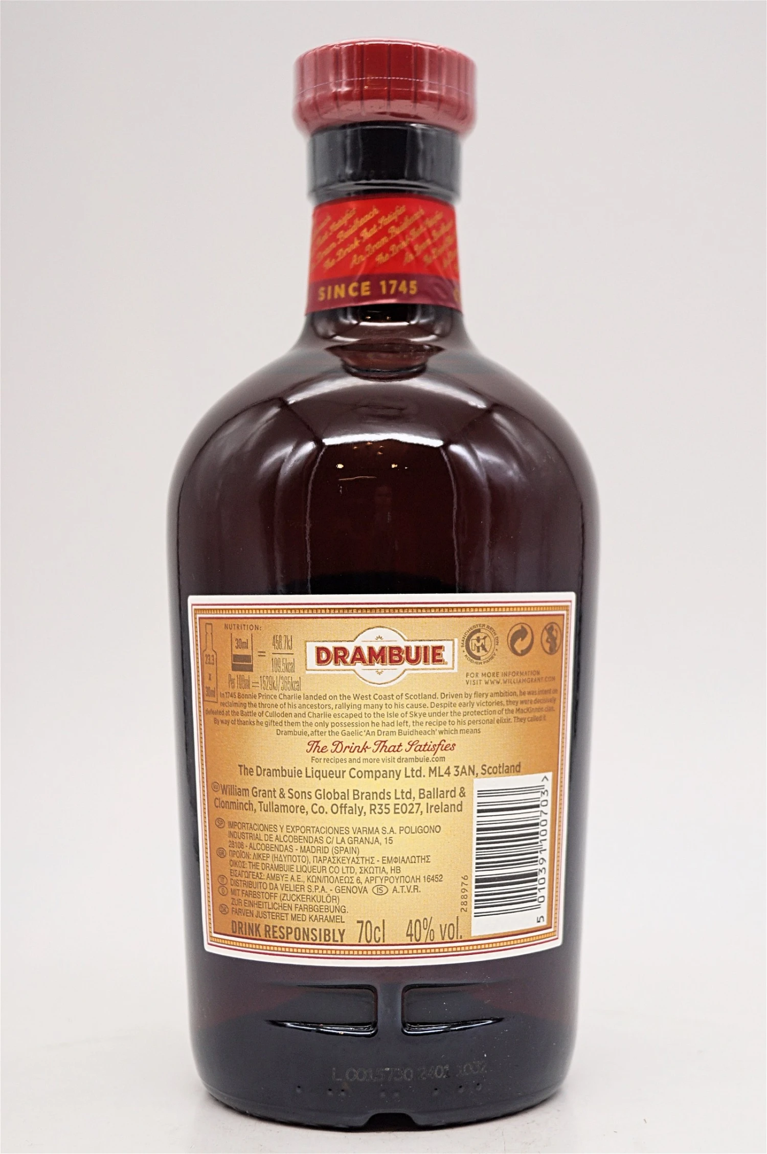 Drambuie ist ein Whiskylikör. Eine Mischung aus gereiftem Scotch Whisky, Gewürzen, Kräutern und Heidehonig. Seine Ursprünge lassen sich auf ein geheimes Rezept zurückführen, das sein königlicher Apotheker im 18. Jahrhundert für Bonnie Prince Charlie entwickelt hatte. Der Name Drambuie leitet sich vom schottisch-gälischen „An Dram Buidheach“ ab und bedeutet „The Drink that Satisfies“.