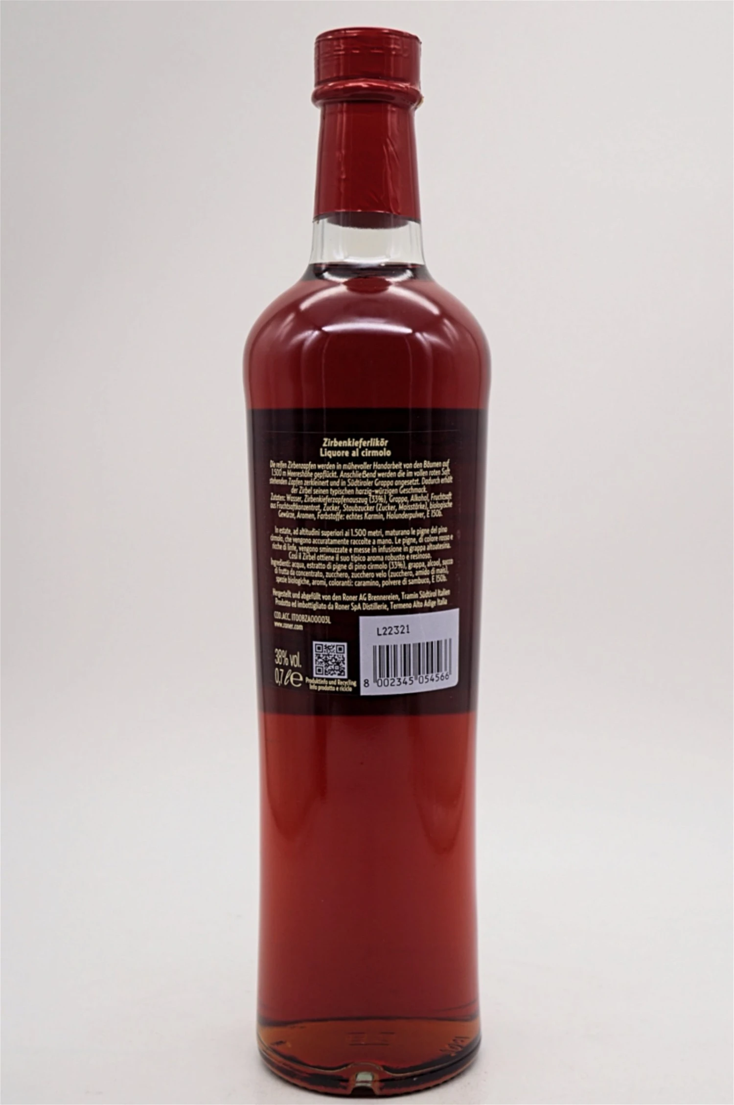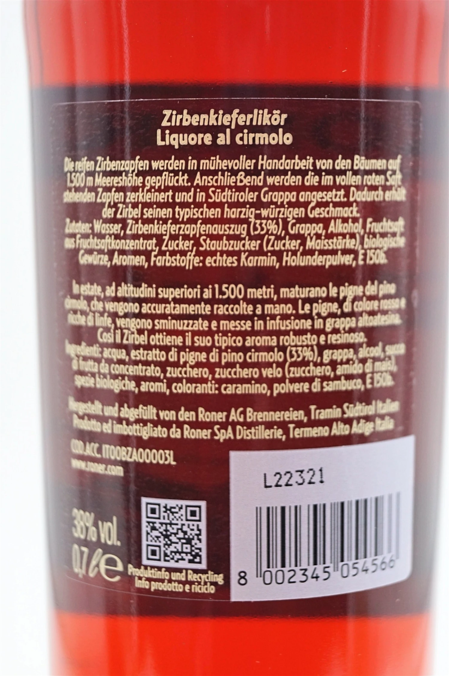 Die reifen Zirbenzapfen werden in mühevoller Handarbeit von den Bäumen auf 1.500 m Meereshöhe gepflückt. Anschließend werden die im vollen, roten Saft stehenden Zapfen zerkleinert und in Roner Grappa angesetzt. Dadurch erhält der Zirbel seinen typisch harzig, würzigen Geschmack.
